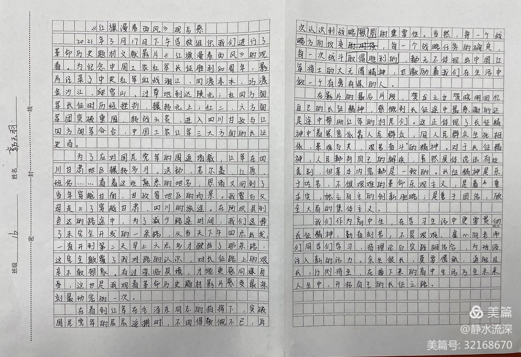 同学们被革命先辈的精神感染,观影认真、投入。 ![]() 《红旗漫卷西风》主要展现了中央红军血战湘江、四渡赤水、巧渡金沙江、爬雪山、过草地到达陕北;红四方面军长征时历经挫折,辗转北上;红二、六军团突破重围,转战云贵、进入四川甘孜与红四方面军会合等伟大历程。 ![]() ![]() 活动结束后,同学们互相交流分享观影体验,纷纷用文章写下自己的感悟,表达了对红军长征精神的由衷敬仰和对党奋斗历程的热情颂扬,并表示要用长征精神激励指导自己的学习和生活。