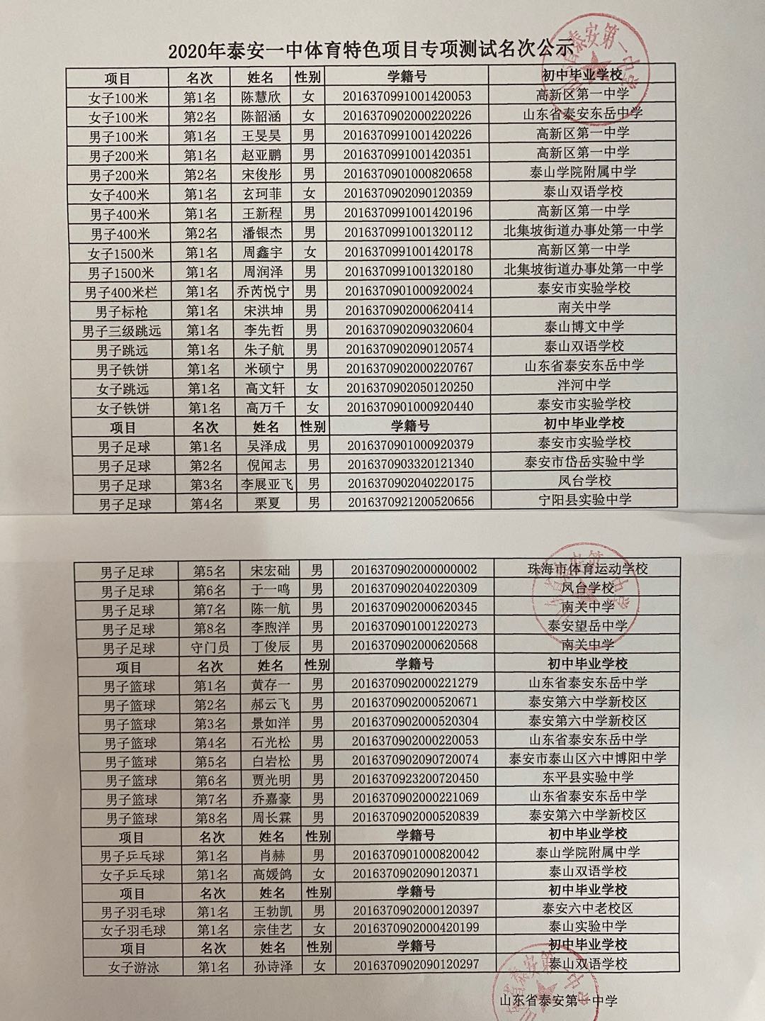 2020年泰安一中体育特色项目专项测试名次公示